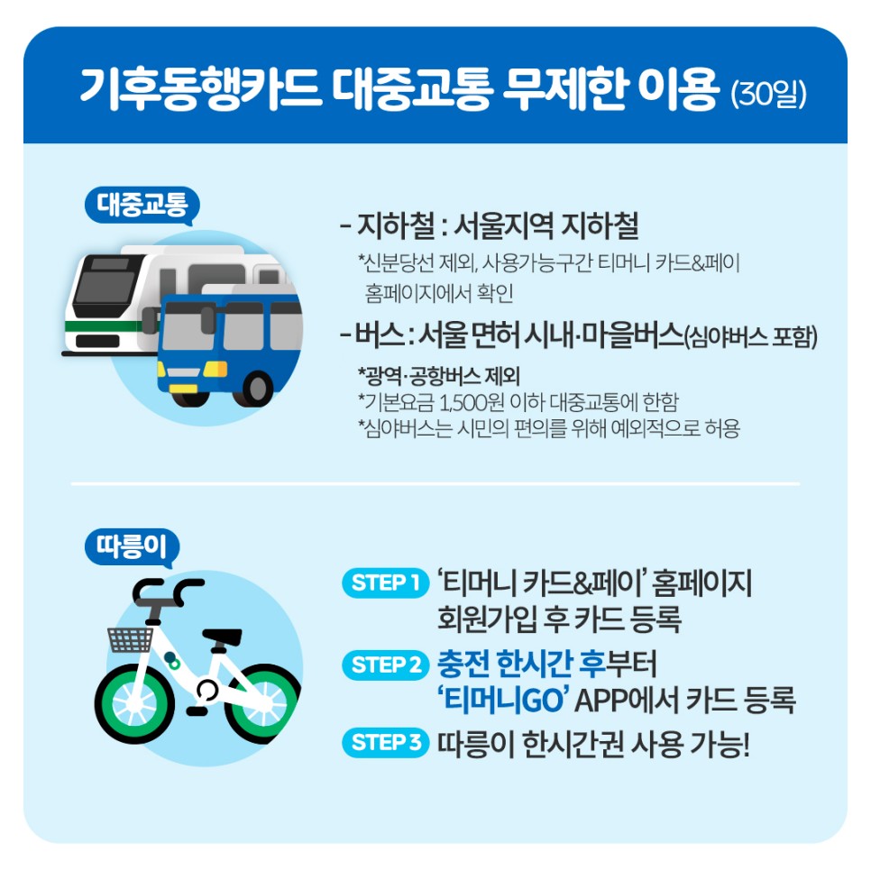 ※ 인천, 경기의 경우 현재 협의중입니다. 기후동행카드는 현재 시범단계로, 적용가능한지 반드시 확인하시길 바랍니다.