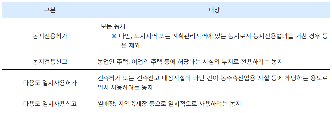 1. 농지전용허가 : 모든농지에 해당됩니다. 다만, 도시지역 및 계획관리지역에서 농지지역협의를 거친 경우 제외됩니다.