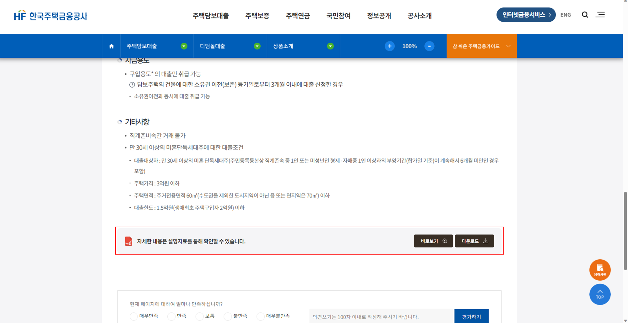 신청대상 민법상 성년 대한민국 국민 접수일 현재 세대주 한국신용정보원 신용정보관리규약 해당사항 없고 CB점수 350점 이상 본인 및 배우자 합산 순자산 가액 5.06억원 이하 대출요건 5억원(신