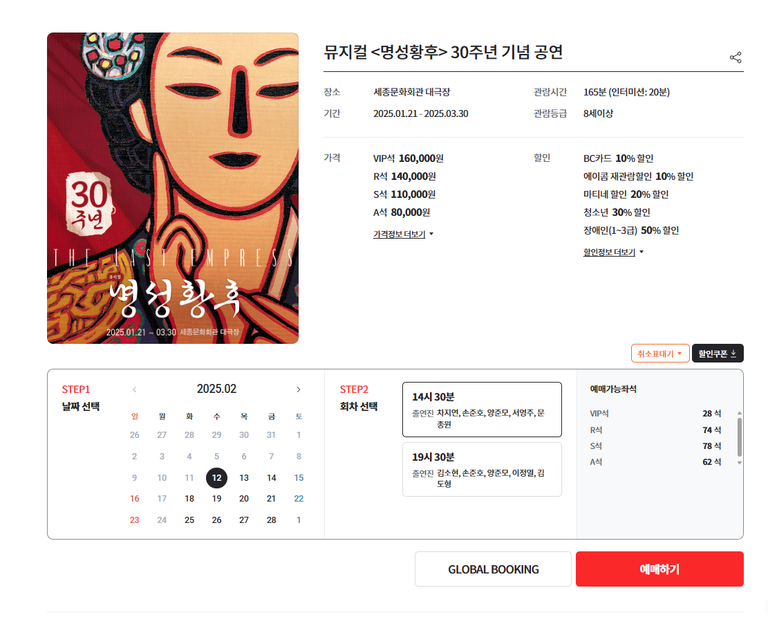 명성황후 뮤지컬은 30년 동안 인기를 꾸준히 이어왔으며, 많은 좌석이 이미 매진 상태입니다. 작년 명성황후 뮤지컬도 빠르게 매진되었던 만큼 이번 기회도 놓치지 않도록 서둘러 예매하세요!