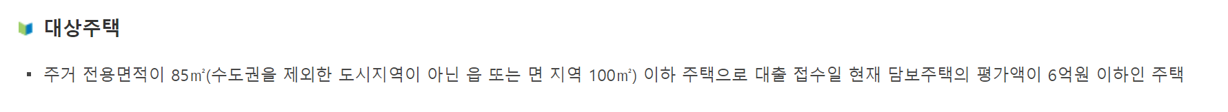 1. 대상주택의 경우 주거전용면적이 85제곱미터(약25.7평)이하인 주택에 한하며, 주택가격의 경우 6억원 이하인 주택인 경우 가능합니다.