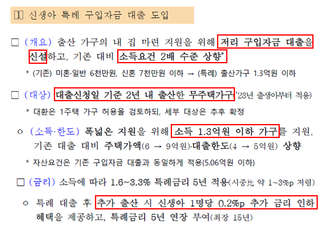 신규 출산 시 소득요건 등을 대폭 완화한 구입・전세 대출 지원, 추가출산 시 우대금리 혜택을 부여해 금융부담 경감