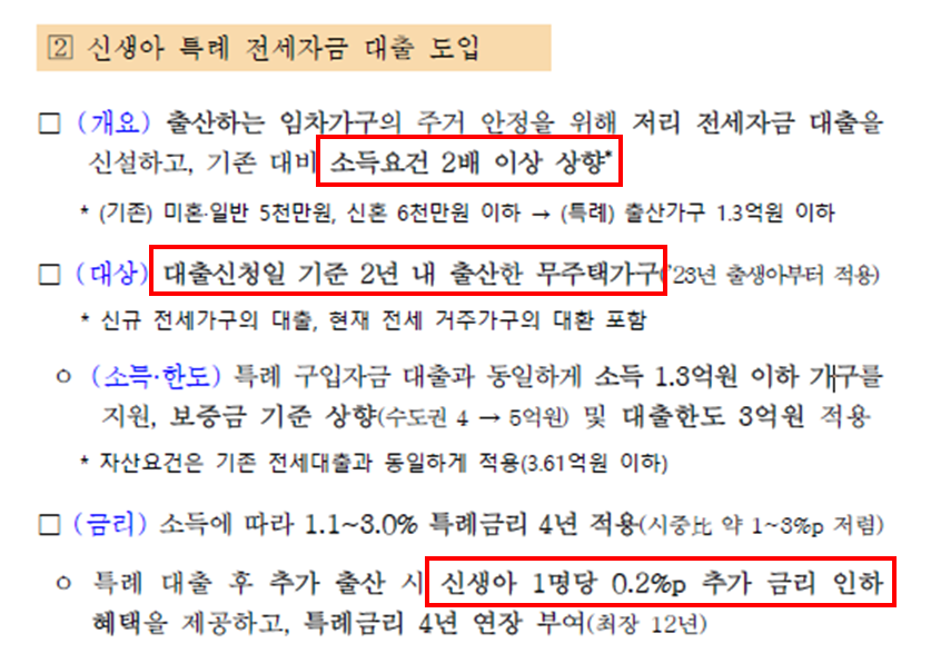 신규 출산 시 소득요건 등을 대폭 완화한 구입・전세 대출 지원, 추가출산 시 우대금리 혜택을 부여해 금융부담 경감