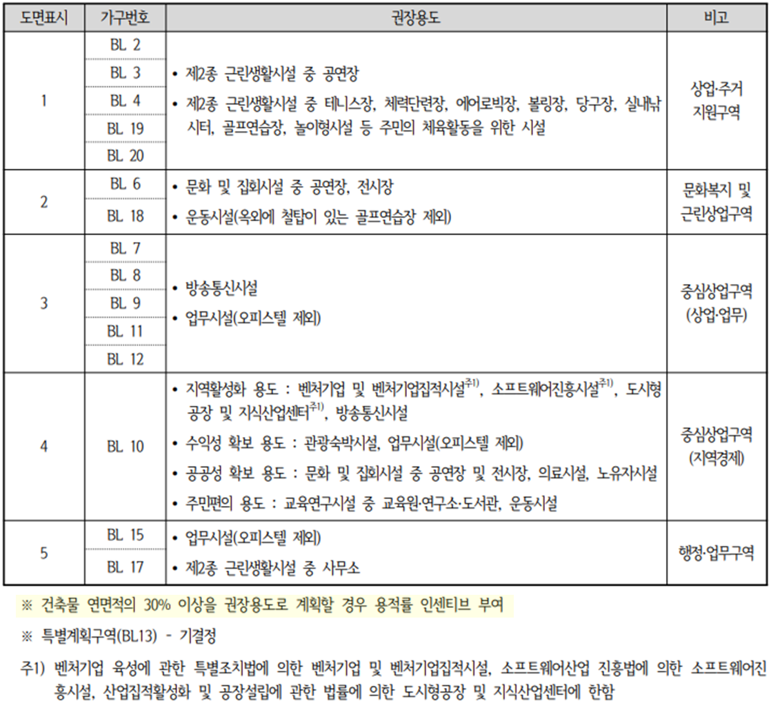 목동아파트 1~3단지의 경우 자세한 계획사항은 나오지 않지만, 목동 지구단위계획의 중심 부분의 경우 구분된 부분현재 지구단위계획지침 상 건축물 연면적의 30%이상을 권장용도로 계획할 경우 용적률 인센티브 완화항목을 적용받을 수 있겠네요.