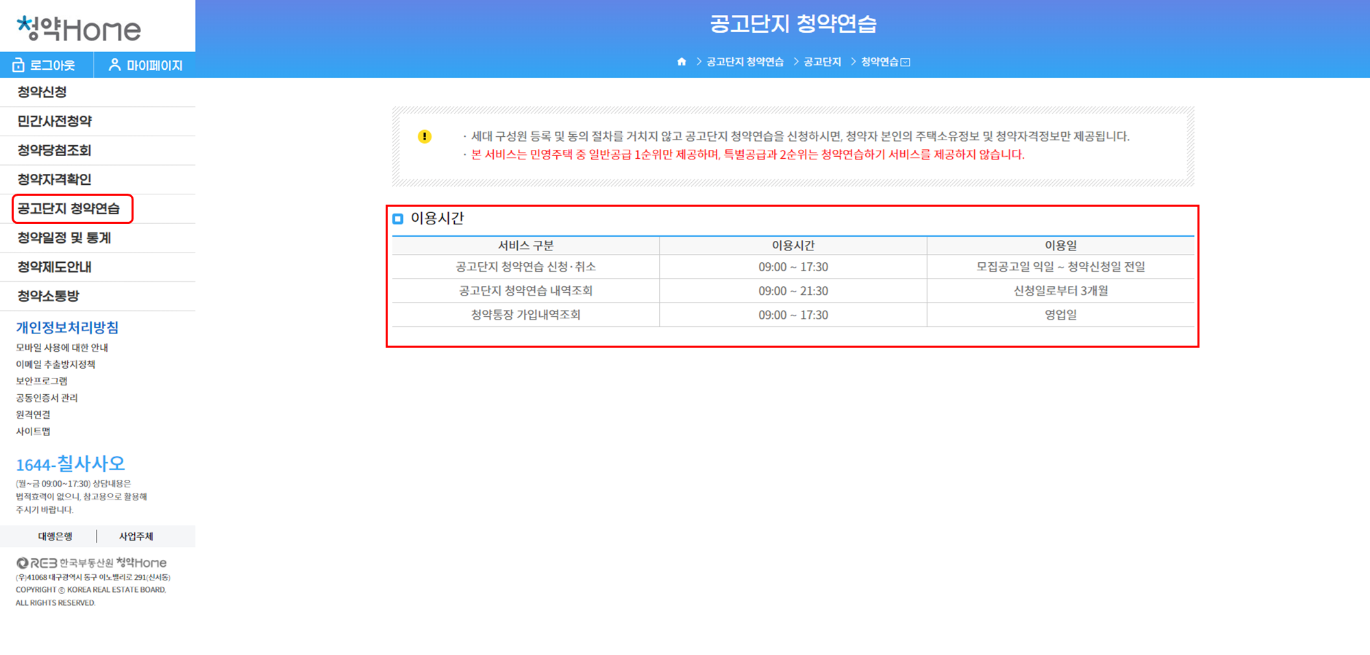 더해, 청약전 청약홈 사이트에서 제공하는 공고단지 청약연습으로 예행연습을 해보시길 추천드립니다. 청약연습 이용시간의 경우 오점 9시부터 오후 5시30분(9시30분)까지 제공하는 서비스에 따라서 이용시간이 다르니 이점 숙지하시길 바랍니다.